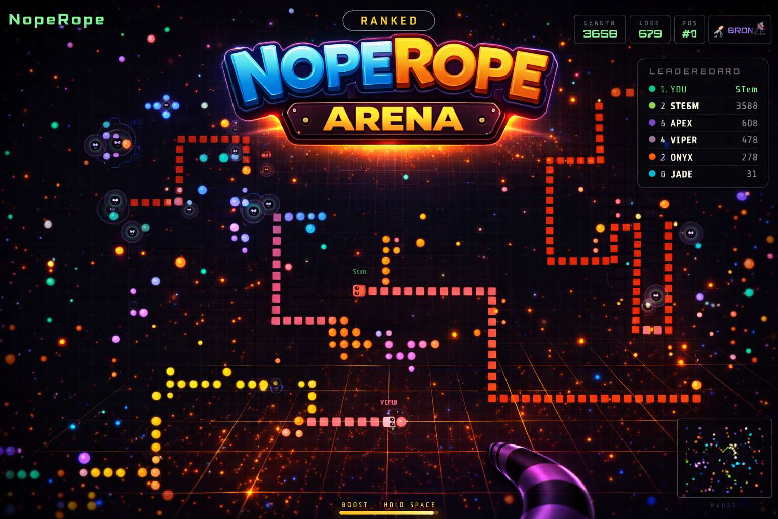 NopeRope Arena throws you into a glowing neon battlefield where survival depends on movement, timing, and nerve. Collect pellets, grow longer, dodge danger, and use boost wisely as you compete against rival ropes for score, coins, and rank.